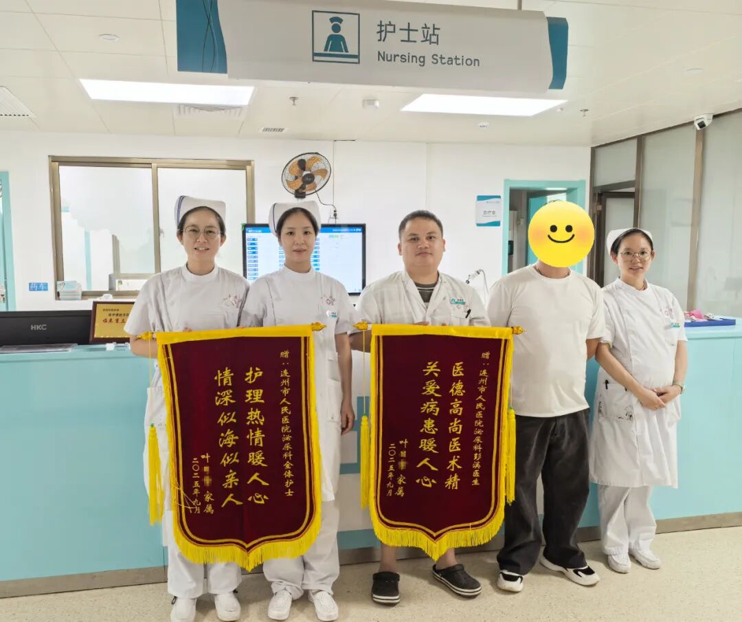 近日,我院泌尿外科上演了温馨一幕。叶先生(化名)将两面饱含深情的锦旗分别赠予主管医生彭溪及泌尿外科全体护士,锦旗上“医德高尚医术精 关爱病患暖人心”和“护理热情暖人心 情深似海似亲人”的金色大字,不仅承载着患者的真挚谢意,更是对泌尿外科团队精湛医术与优质服务的高度认可。