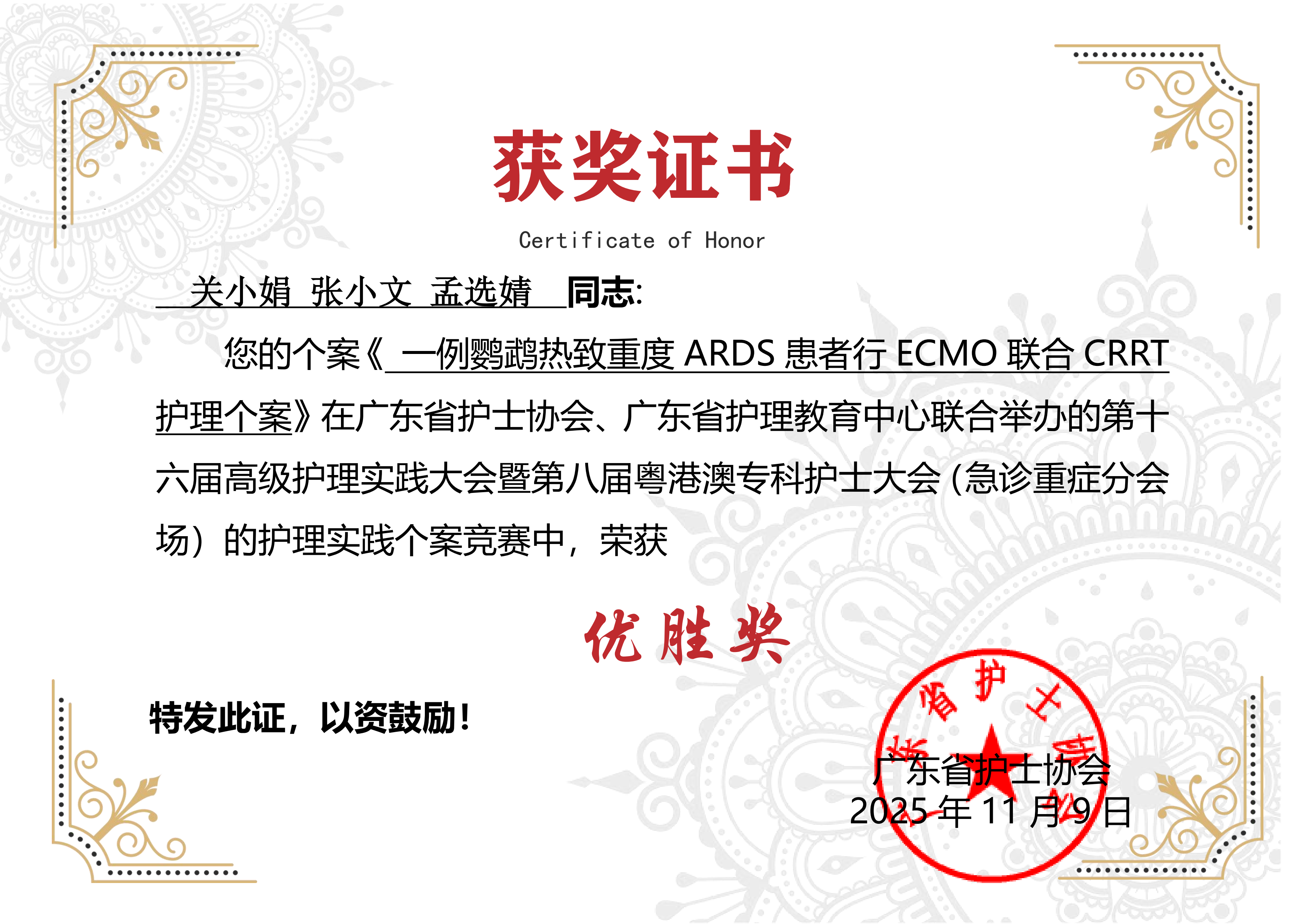 另一案例《一例鹦鹉热致重度ARDS患者行ECMO联合CRRT护理个案》,则聚焦罕见危重感染患者的综合救护,系统总结了该类患者在ECMO联合CRRT支持期间的精细化监护与专业护理要点,获得评审专家认可,荣获优秀奖,体现了我院在处理疑难重症方面的技术深度与专业积累。