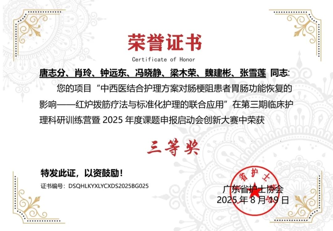 近日,为进一步提升护理人员科研创新能力,由广东省护士协会主办、暨南大学附属第一医院承办的临床护理科研创新大赛在广州举行。荣获一、二、三等奖的项目将获得广东省护士协会的立项和专项资金资助。经过激烈角逐,我院普通外科二区(肝胆胃肠外科)及康复医学科护理联队凭借创新项目《中西医结合护理方案对肠梗阻患者胃肠功能恢复的影响——红炉拨筋疗法与标准化护理的联合应用》脱颖而出,荣获三等奖,并获广东省护士协会专项立项及资金资助。不仅彰显了我院护理团队在科研领域的探索与实践能力,更意味着该科研项目获得了更高的研究平台和资金支持,为后续的深入研究和临床推广奠定了坚实基础。