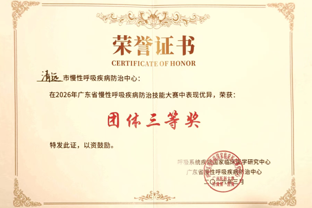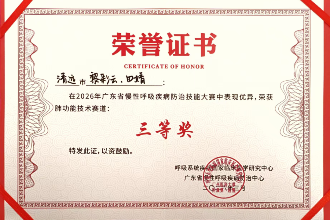大会同时举行2026年广东省慢性呼吸疾病防治技能大赛,来自全省各级医疗机构的代表同台竞技,展现专业风采,以技能比拼促能力提升,为全省慢性呼吸疾病防治队伍建设夯实基础。我科呼吸与危重症医学科护士黎彩云作为清远市代表队成员之一,凭借扎实的专业技能,获肺功能技术赛道三等奖,并助力清远市代表队夺得团体三等奖,体现了我院在呼吸与危重症医学学科建设及人才培养方面取得的积极成效。
