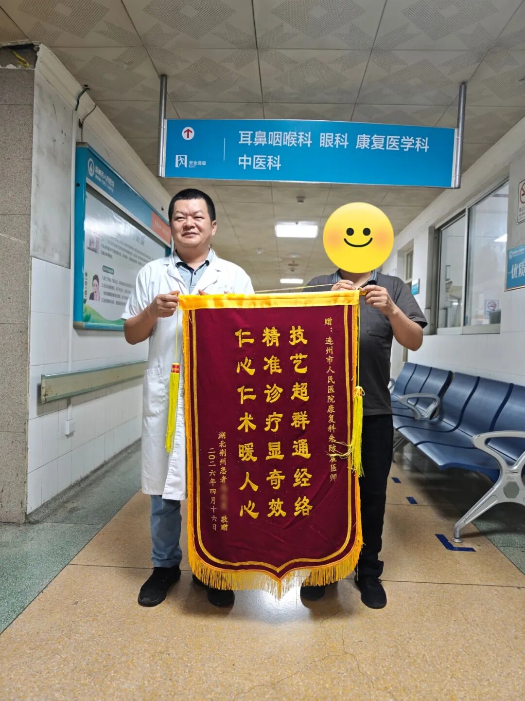 第二面锦旗来自湖北荆州的马先生(化名),锦旗上“技艺超群通经络,精准诊疗显奇效,仁心仁术暖人心”的烫金大字表达出患者对朱防震副主任医师和康复医学科团队专业诊疗效果的认可,也饱含着医患同心、共抗病痛的温暖情谊。