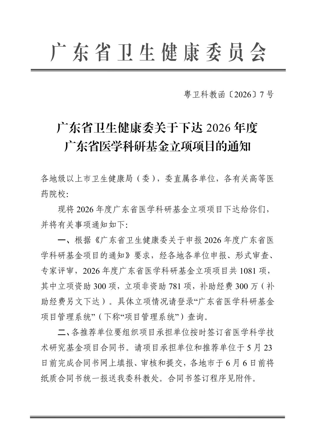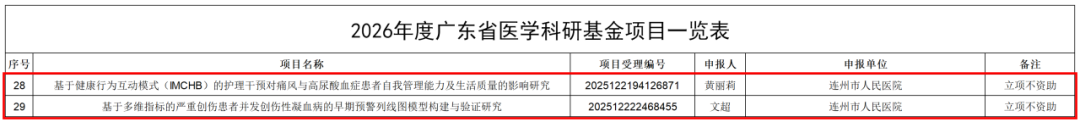 近日,广东省卫生健康委公布了2026年度广东省医学科研基金立项项目名单,连州市人民医院有2个项目成功入选。这一成绩的取得,不仅标志着我院科研能力迈上新台阶,也充分展现了我院医务人员立足临床、勇于创新的科研精神与扎实的学术水平。