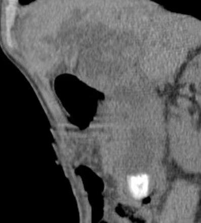 术前CT显示胆总管1.7X2.2cm结石影。