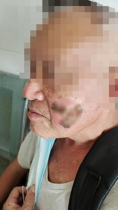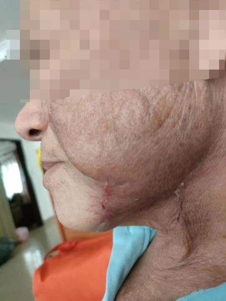 近日,冯大爷因“发现左面部肿物3年”来我院就诊,在外院行肿物病理检验,诊断为皮肤高分化鳞状细胞癌,恶性肿瘤需扩大手术切除范围,难以正常缝合,只能进行植皮或局部皮瓣转移。该患者左侧面部皮肤巨大肿块伴破溃、出血,身心都备受煎熬,考虑到患者年龄较大,如进行植皮术,手术费用较高,愈后差且易产生凹陷与瘢痕,颜色也差异较大、影响美观。经耳鼻咽喉科手术团队讨论,为冯大爷进行左面部鳞状细胞癌切除+蝶形皮瓣转移术,术后冯大爷恢复良好,面部无明显畸形,现已出院。