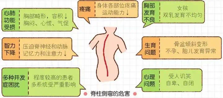 青少年发育过程中,脊柱侧弯易造成身高问题和肩背部不平、高低肩、胸廓畸形、骨盆倾斜、长短腿、姿势不良等各种体态发育问题。以及脊柱变形导致的肩背腰部疼痛,出现神经受压、肢体感觉障碍、下肢麻木、大小便异常等症状, 严重者影响心肺功能甚至危及生命。