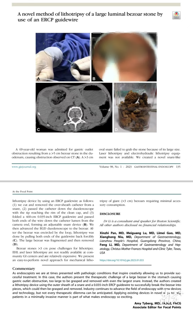国际权威期刊《胃肠内镜》(Gastrointestinal Endoscopy)今年6月在线刊登了连州市医疗总院人民医院(下称“连州人医”)消化内科团队的论文《单通道内镜联合斑马导丝碎取十二指肠球腔巨大结石1例》(A novel method of lithotripsy of a large luminal bezoar stone by use of an ERCP guidewire)。