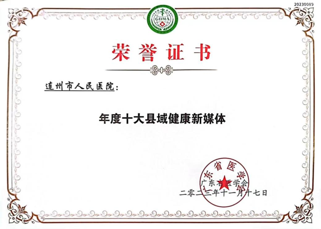 连州市人民医院微信公众号荣获“年度十大县域健康新媒体”称号