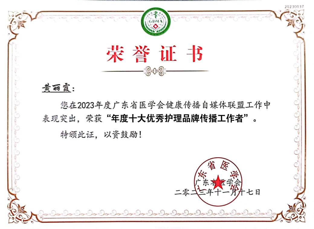 医院宣传科科长黄丽霞荣获“年度十大优秀护理品牌传播工作者”称号