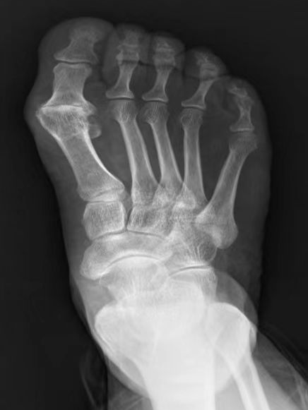 石阿姨5年前无明显诱因出现右足第1跖趾关节处疼痛、肿胀,半年前肿痛症状明显加重,行走、负重时活动受限明显,曾在多家医院就诊效果欠佳,在家属的陪同下到我院创伤骨科就诊。