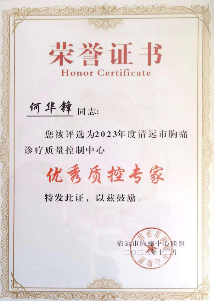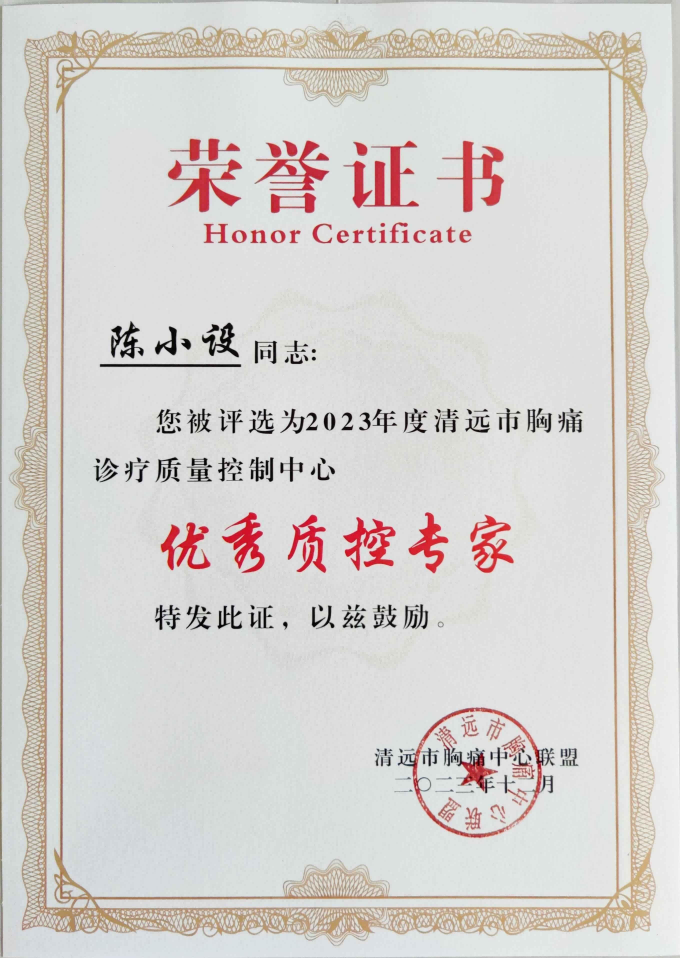 2023年我院胸痛中心交出了亮眼的“成绩单”!在广东省胸痛中心质控检查中,获得127.44分的优异成绩,被广东省胸痛专业质量控制中心、广东省胸痛中心协会授予2023年度基层版胸痛中心“质控先进单位”称号,在全省基层版胸痛中心中排名第一!在2023 年清远市胸痛中心培训、总结暨表彰会议上,我院荣获“清远市优秀胸痛中心质控单位”“清远市优秀胸痛救治单元帮扶单位”“清远市优秀胸痛中心单位”称号,心血管内科主任陈小设、急诊医学科副主任何华锋被评为“清远市优秀质控专家”,医院帮扶的13家胸痛救治单元荣获“清远市优秀胸痛救治单元”称号。