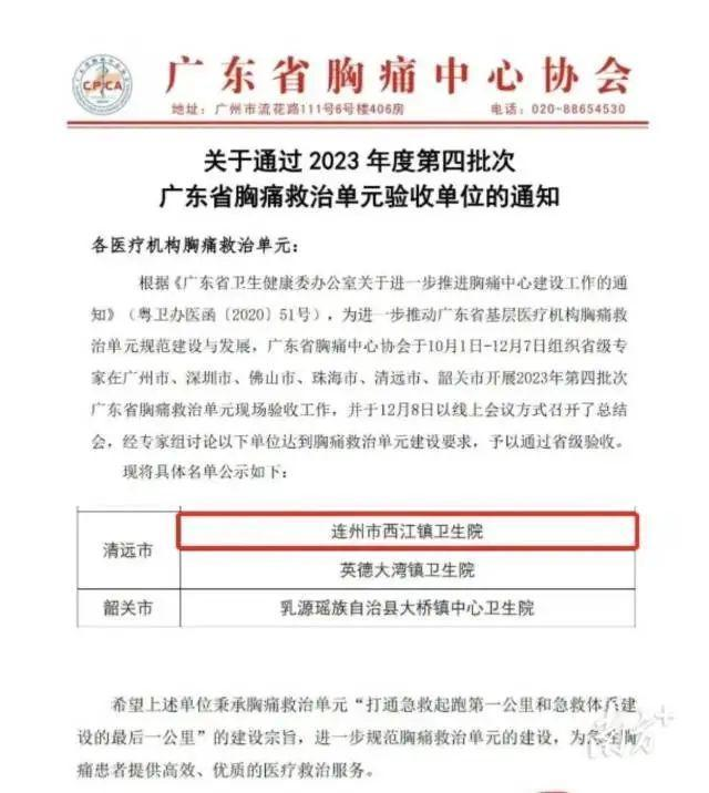 广东省胸痛中心协会日前发布了《关于通过2023年度第四批次广东省胸痛救治单元验收单位的通知》,连州市医疗总院西江镇分院(连州市西江镇卫生院)顺利通过省级验收。