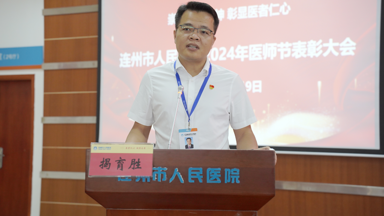 连州市卫生健康局党组书记李建成在致辞中向全院医师致以节日的问候和美好的祝福,对常年奋斗在临床一线的医师们表示衷心的感谢和崇高的敬意。李书记强调,全体医务工作者要秉承初心、牢记医者使命,认真贯彻落实上级的工作部署,做好守护人民健康的忠诚卫士,不辜负人民群众对健康的新期盼!