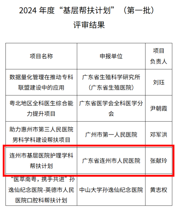 连州市人民医院护理学科项目入选2024年广东省卫济医学发展基金会首批“基层帮扶计划”