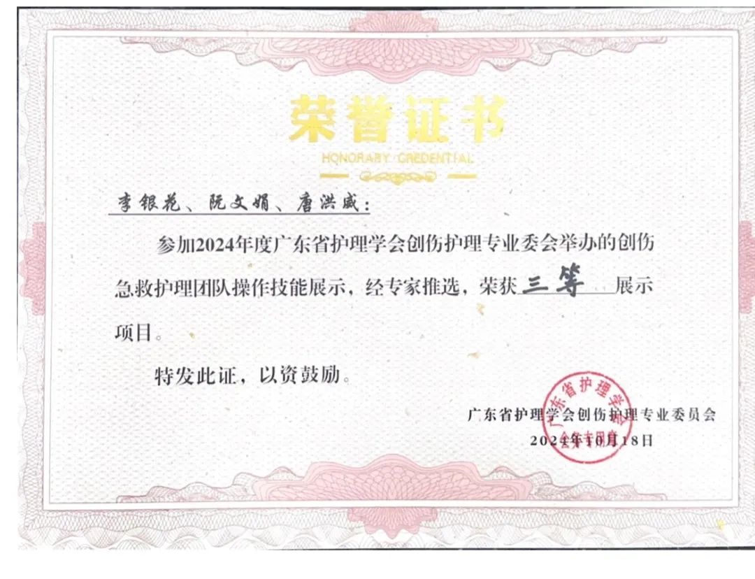 近日,我院急诊护理团队在广东省护理学会创伤护理专业委员会举办的“创伤急救护理团队操作技能展示活动”中荣获三等奖!本次活动,共有23家省市级医疗机构、130余名护理人员参赛。