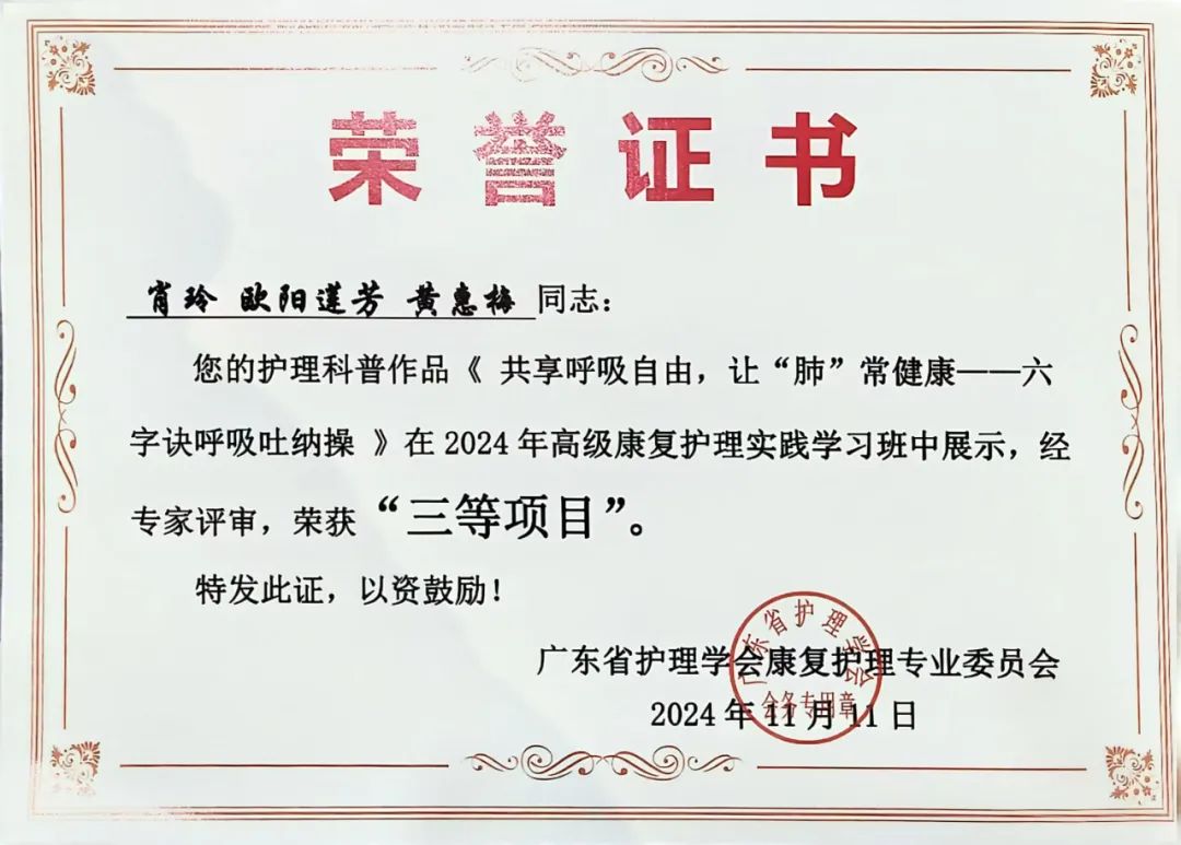 我院康复医学科、呼吸内科护理联队参加省级科普比赛,荣获“三等项目” 2024-11-13 2024年11月8日至11月11日,由广东省护理学会康复护理专业委员会主办的2024年广东省高级康复护理实践学习班在广州顺利举行,会上举办了科普视频展示,连州市人民医院康复医学科、呼吸内科护理联队的作品《共享呼吸自由,让“肺”常健康——六字诀呼吸吐纳操》荣获“三等项目”。 此次参赛的作品共计54个,经过专家组的严格评审,结合科学性、创新性、实用性、制作水平和传播性等方面的考量,最终评选出前34个作品进入决赛。连州市人民医院康复医学科、呼吸内科护理联队的作品凭借其独特的创意和实用价值,得到了专家组的一致认可,并荣获“三等项目”。随着社会的发展和人民生活水平的不断提高,人民群众对健康的需求日益增强,对治未病、康复治疗及训练的需求也愈发迫切。连州市人民医院于2024年6月27日正式成立了康复医学中心。这一中心的成立标志着连州市人民医院在康复医学领域迈出了重要的一步,致力于将康复医学科打造成为多学科联合发展的多功能、全方面的康复医学中心。康复医学中心的成立,旨在将康复理念贯穿于疾病预防、诊疗、康复的全过程,通过“康复下临床,服务到床边”的服务模式,为患者提供更为全面、及时的康复服务。康复医学中心不仅运用传统中医的针灸、理疗、推拿等疗法,还结合现代康复技术,在患者治疗的超早期进行康复介入,使更多患者既能享受临床科室的医疗保障,又能受益于早期康复,从而尽快改善功能障碍,回归家庭和社会,减轻就医负担。与此同时,连州市人民医院康复医学科护理团队积极响应《中国护理事业发展规划纲要(2021-2025)》的要求,将康复护理专科作为重点发展方向,不断深化康复护理理念,拓展康复护理的内涵,推动康复护理事业的快速发展。在院领导的正确引导下,康复护理团队树立“大卫生、大健康”的观念,积极推动“以治病为中心”向“以人民健康为中心”转变,加强防治结合,落实预防为主的方针,大力推进各项康复护理工作。此外,连州市人民医院康复医学科护理团队还积极投身于各类科普宣传活动,致力于普及科学健康知识,为提升公众健康素养贡献力量。 上一篇:我院创伤中心高分通过广东省三级建设单位评审 下一篇:重症营养 “喂”生命护航|我院举办2024年连阳地区“重症患者营养支持”培训班