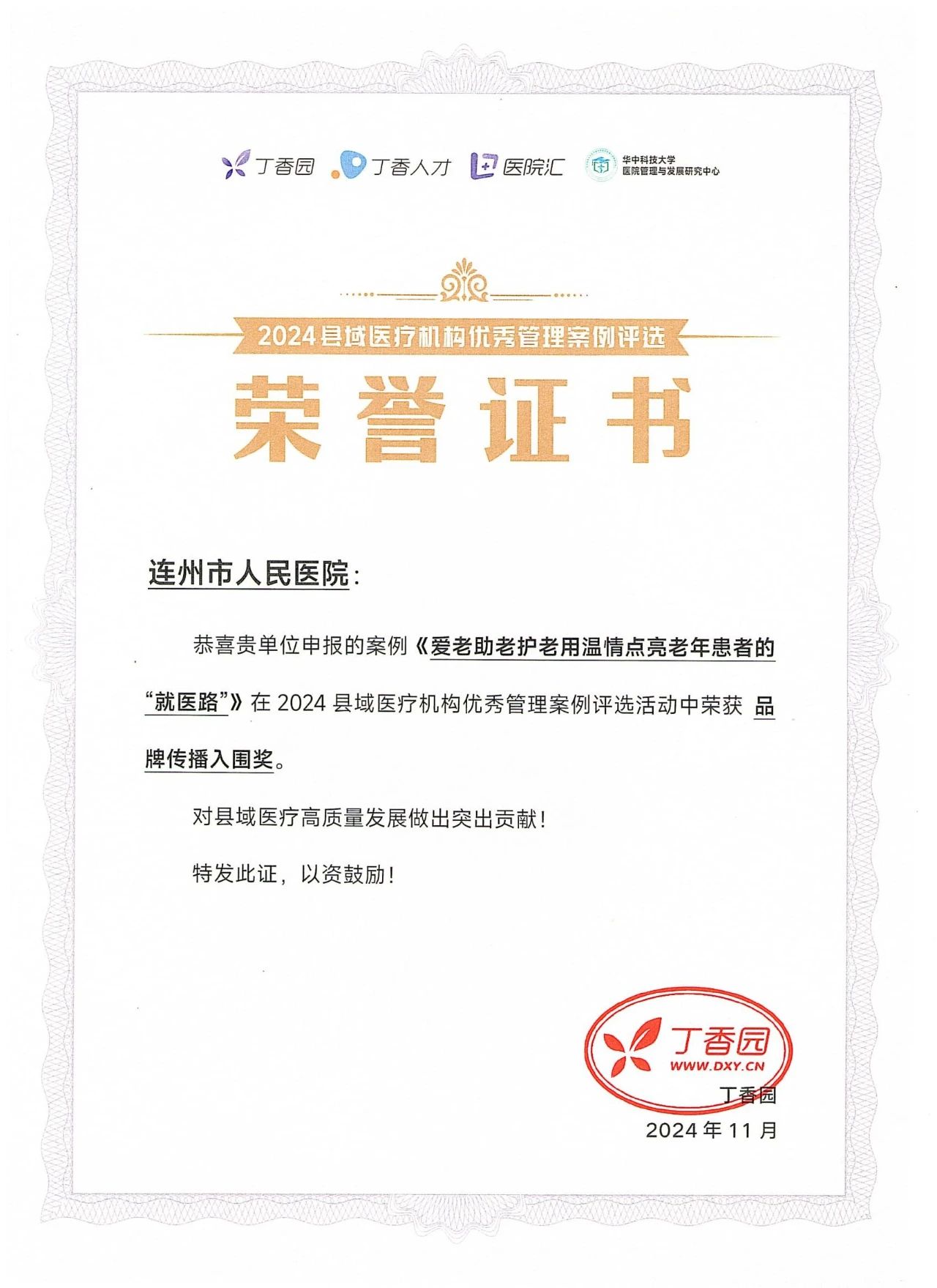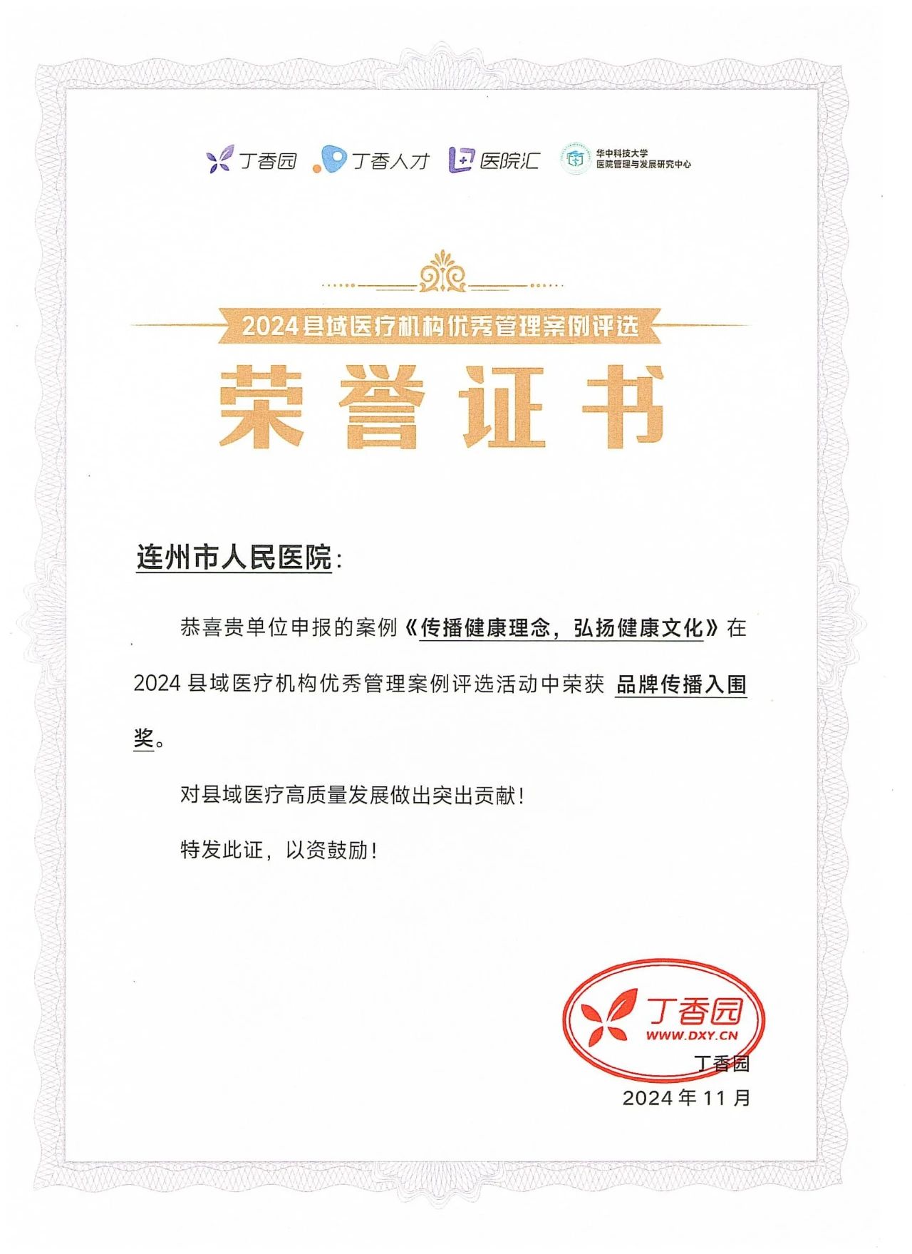 活动共收到来自全国近百家县域医院报送的近两百个案例,经10余位来自县域头部医院、县市专业协会、高校医管智库等领域的专家学者组成评委会评审,我院提交的《传播健康理念,弘扬健康文化》和《爱老助老护老用温情点亮老年患者的“就医路”》两个案例,凭借其在品牌传播、患者服务等方面的卓越表现,成功脱颖而出,荣获了“品牌传播入围奖”。
