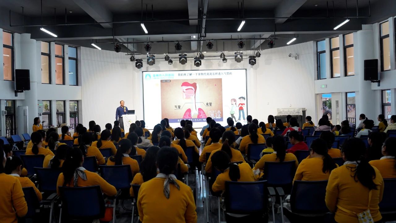 连州市人民医院儿科副主任唐小峰根据幼师的工作需求和幼儿的特点,结合幻灯片图文资料和专业的操作演示,生动细致地讲解了海姆立克急救法的急救手法及注意要点,并针对应急救护技能进行现场操作演练。